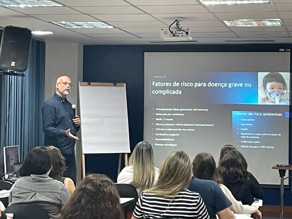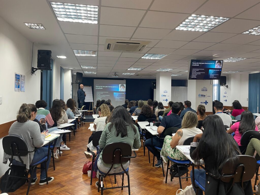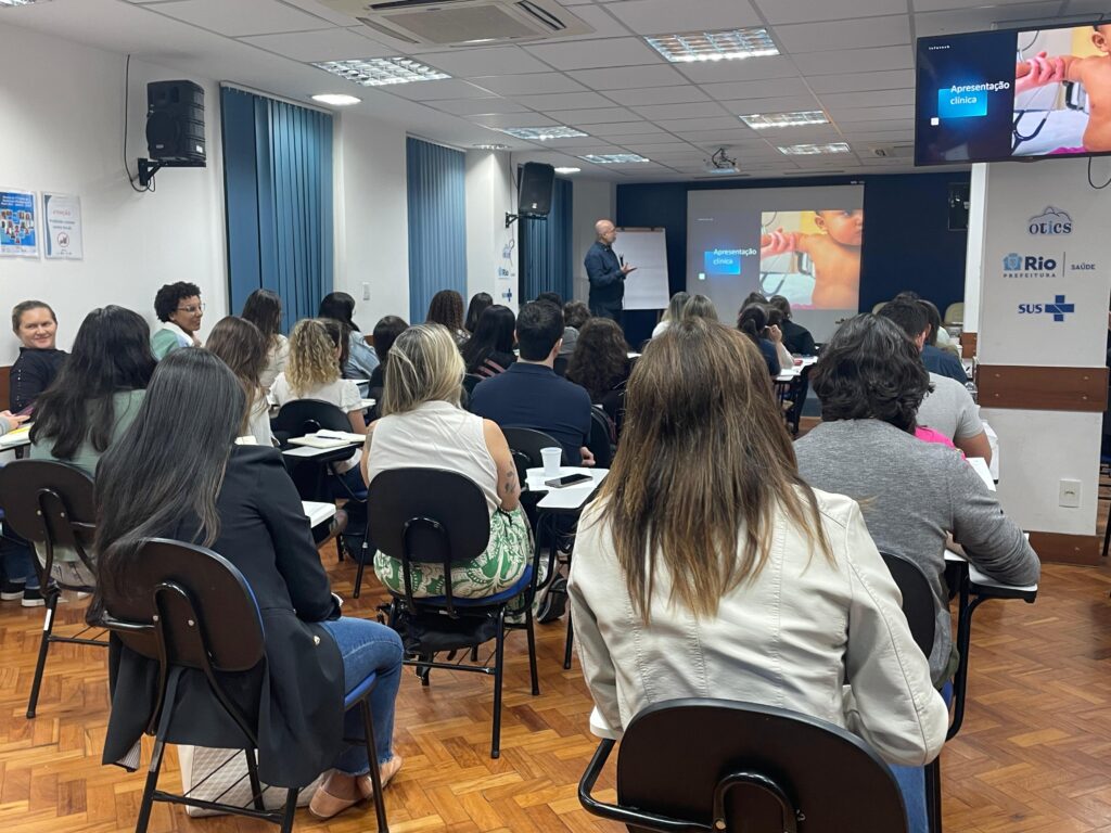 Nesta segunda-feira, 16/06, médicos, enfermeiros e residentes participaram de uma capacitação sobre atendimento à bronquiolite, realizada no auditório Barbara Starfield, no OTICS Sede. A atividade contou com a presença do médico intensivista Bruno Bohme, do Hospital Universitário Pedro Ernesto (HUPE), que conduziu a apresentação técnica. O encontro teve como objetivo atualizar os profissionais sobre o manejo clínico da doença, especialmente durante o período sazonal de maior incidência.