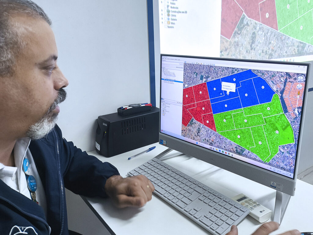 Durante a atividade, os participantes utilizaram o Google Earth Pro, ferramenta que possibilita uma visualização detalhada e tridimensional do território, contribuindo para maior precisão na definição das áreas de cobertura das unidades de saúde.