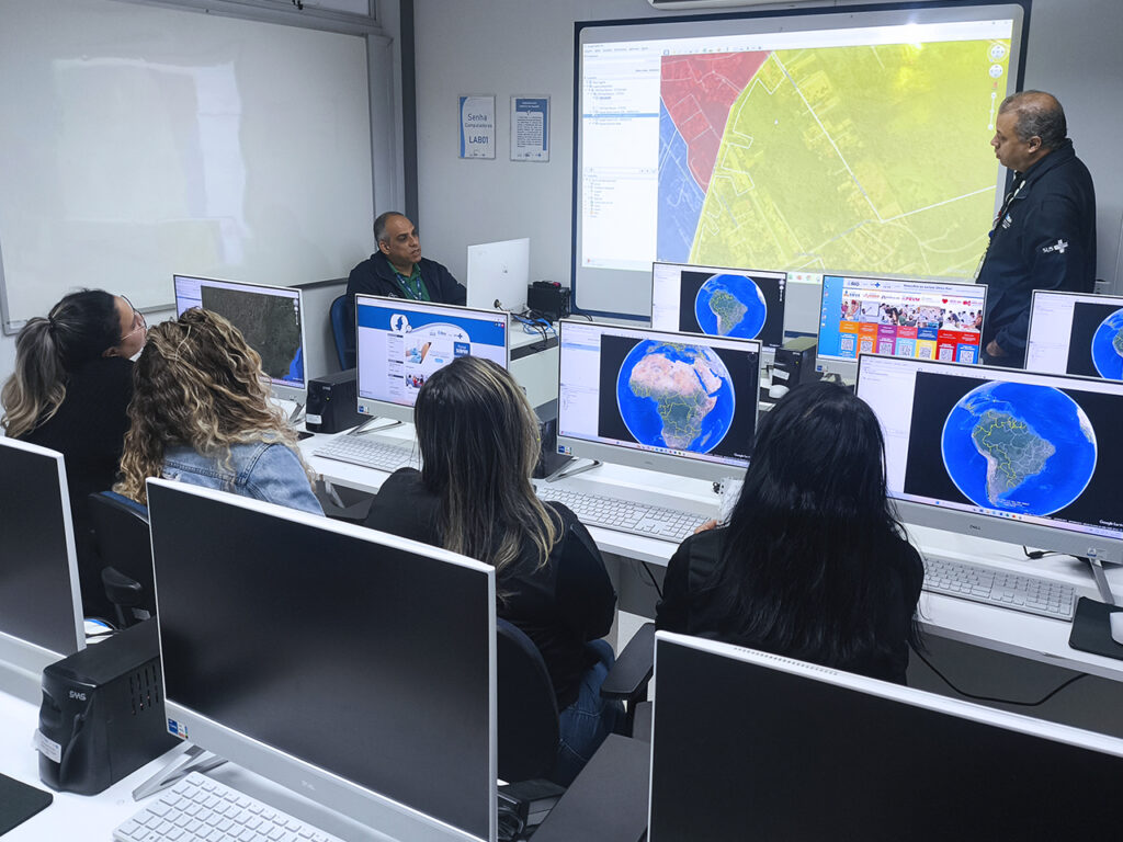 Durante a atividade, os participantes utilizaram o Google Earth Pro, ferramenta que possibilita uma visualização detalhada e tridimensional do território, contribuindo para maior precisão na definição das áreas de cobertura das unidades de saúde.