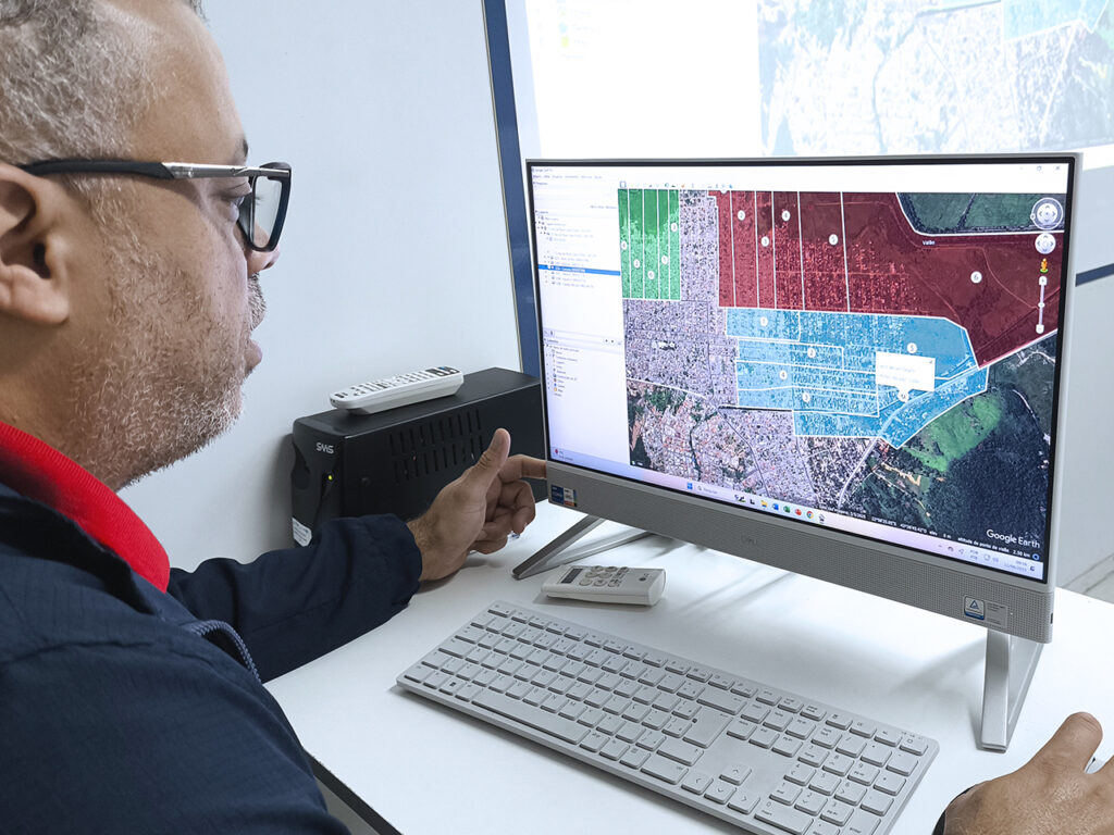 Durante a atividade, os participantes utilizaram o Google Earth Pro, ferramenta que possibilita uma visualização detalhada e tridimensional do território, contribuindo para maior precisão na definição das áreas de cobertura das unidades de saúde.