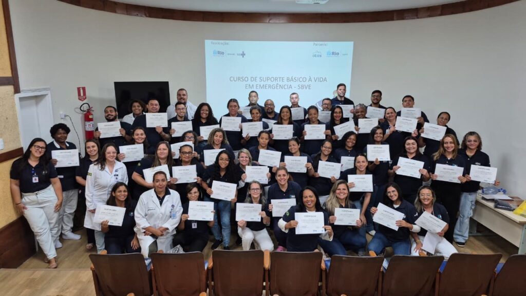 No dia 4 de novembro de 2025, segundo dia do mutirão “Rocha Fará” em Campo Grande, a Rede OTICS-Rio/SMS-RJ, em parceria com o NUFOPEP/Riosaúde, realizou a 101ª turma do Curso de Suporte Básico à Vida em Emergências (SBVE), no turno da tarde. A atividade foi voltada aos profissionais de saúde do Hospital Municipal Rocha Faria.