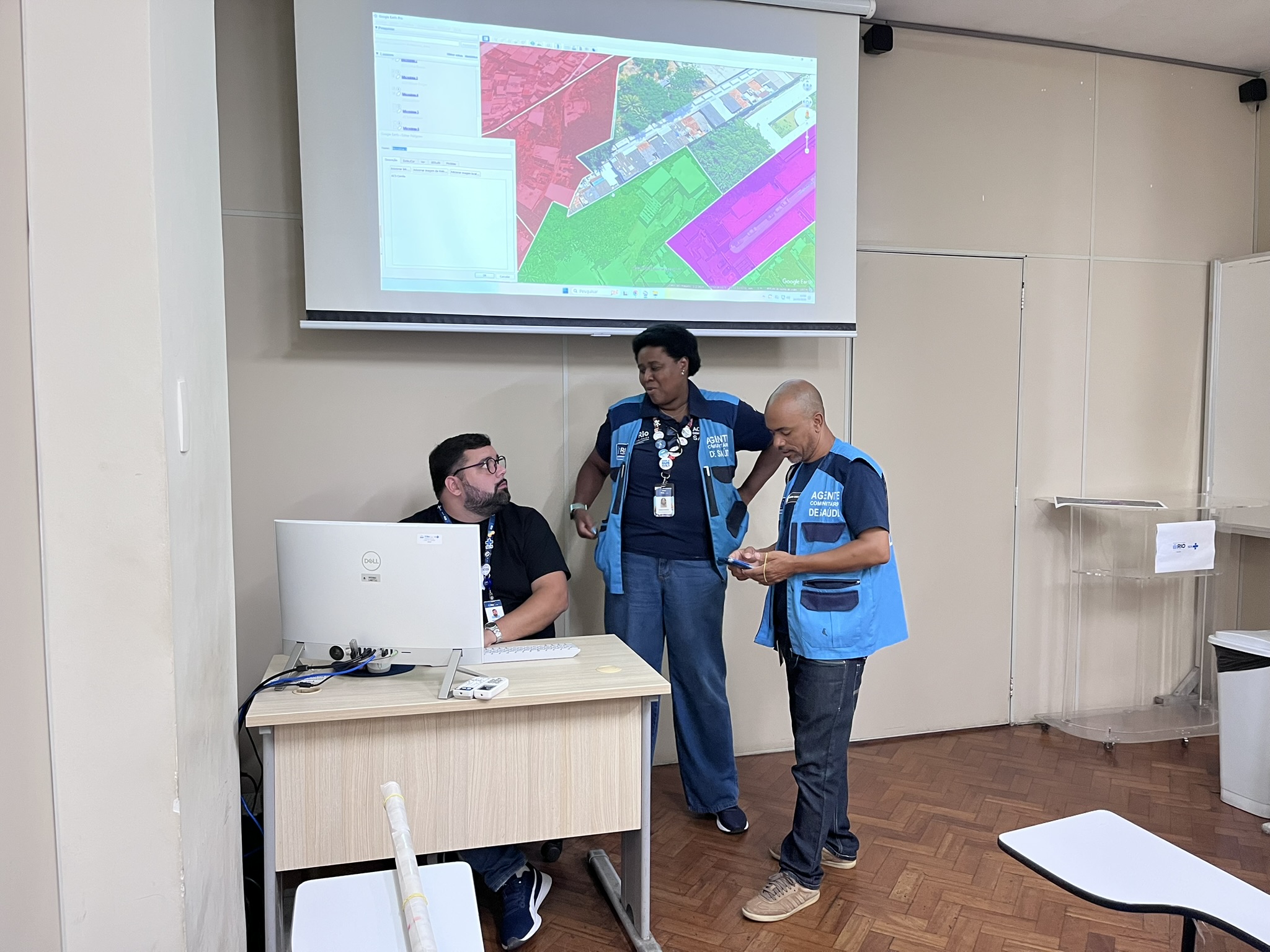 Durante a oficina, mediada por Vinícius Batista – Analista de Projetos OTICS-Rio Centro e Paulo César – Responsável pelo Georreferenciamento/CAP 1.0, foi utilizado o Google Earth Pro, ferramenta que permite a visualização do território em 3D e auxilia no desenho do mapa territorial da unidade.
