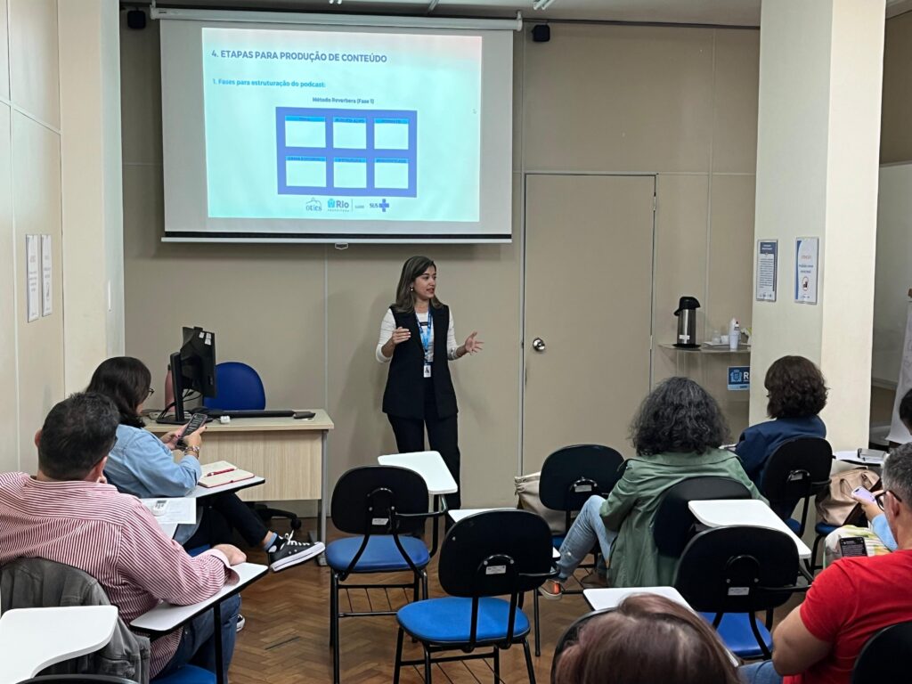 Durante a tarde, foi realizada a palestra temática “Conversando sobre podcast como uma das possibilidades de Produto Técnico-Tecnológico para o trabalho de doutorado profissional”, ministrada pela jornalista Fabiane Muniz – OTICS-Rio.