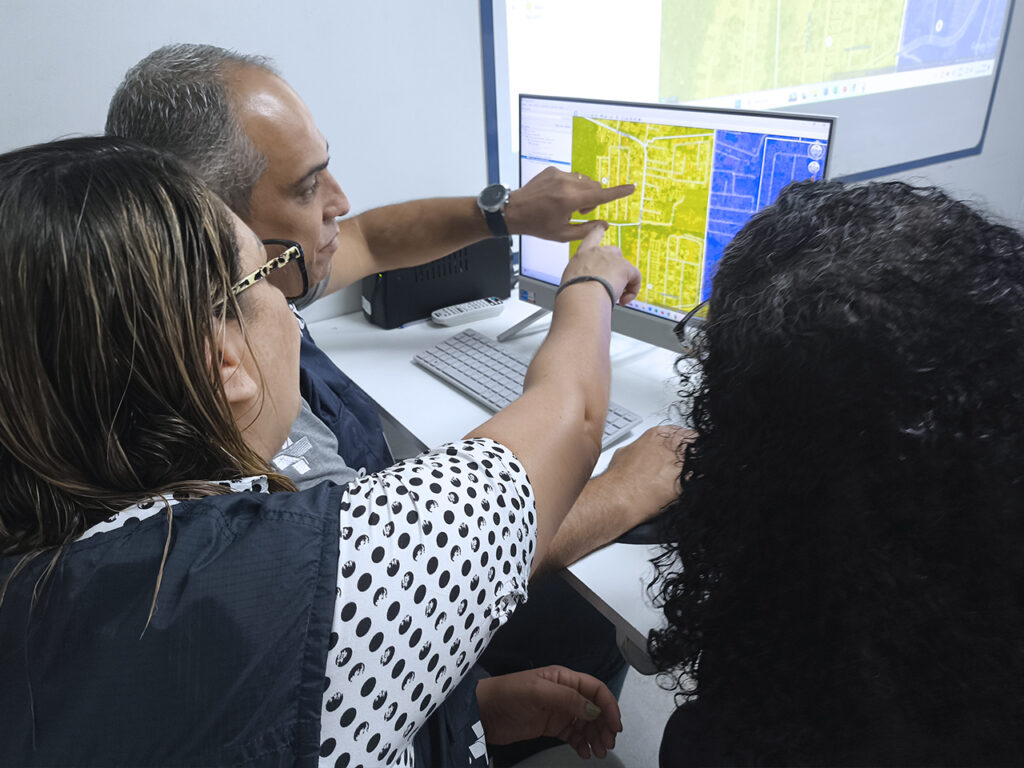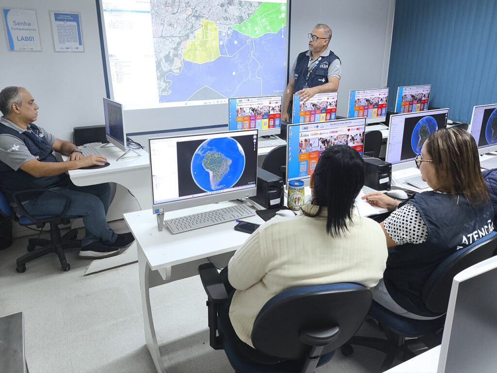 Durante a atividade, os participantes utilizaram o Google Earth Pro, ferramenta que possibilita uma visualização detalhada e tridimensional do território, contribuindo para maior precisão na definição das áreas de cobertura das unidades de saúde.
