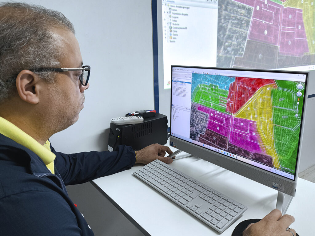 Durante a atividade, os participantes utilizaram o Google Earth Pro, ferramenta que possibilita uma visualização detalhada e tridimensional do território, contribuindo para maior precisão na definição das áreas de cobertura das unidades de saúde.